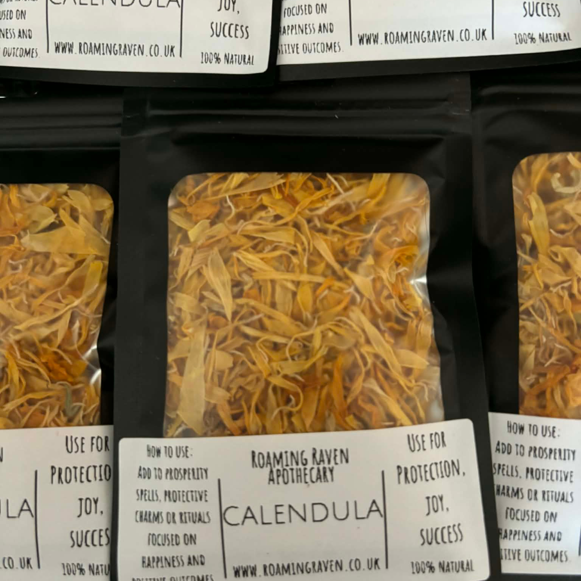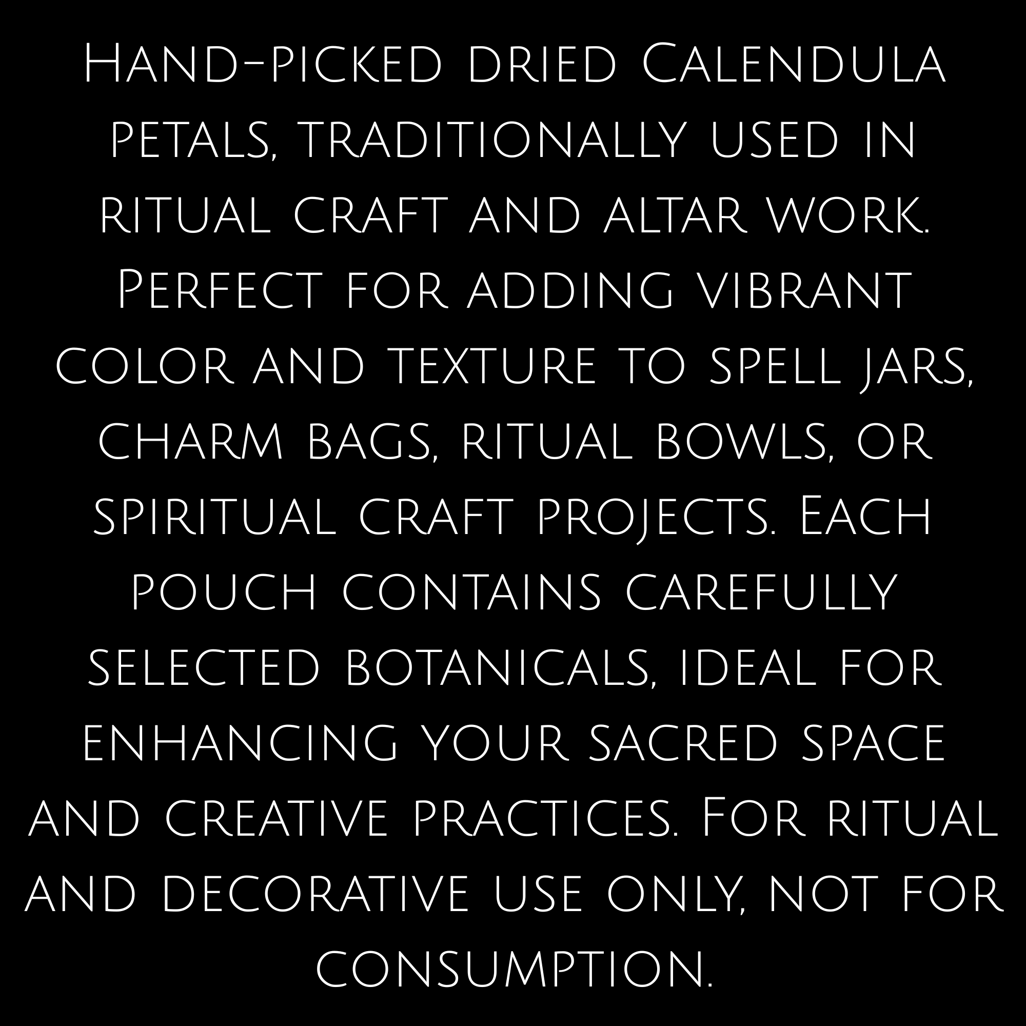 Calendula petals have long been cherished for their bright color, natural beauty, and connection to ritual craft and sacred space. Traditionally used in folk practices and ceremonial settings, these petals bring warmth, texture, and symbolism to altar work, charm bags, spell jars, and other spiritual projects.
